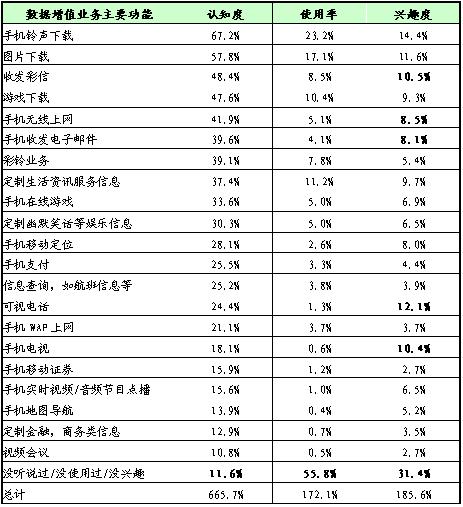 對數(shù)據(jù)增值業(yè)務(wù)主要功能認知度較高的是手機鈴聲下載、圖片下載、收發(fā)彩信等,而使用率、興趣度均較低.