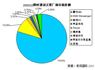 在現(xiàn)階段的中國(guó)即時(shí)通訊市場(chǎng),三大廠商優(yōu)勢(shì)明顯。騰訊 QQ 以其最早進(jìn)入即時(shí)通訊市場(chǎng)、商業(yè)模式創(chuàng)新成功、用戶群龐大等各種因素所帶來的優(yōu)勢(shì)仍舊延續(xù)著對(duì)即時(shí)通訊市場(chǎng)的幾乎壟斷式的占有,市場(chǎng)份額高達(dá)79.6%。緊隨其后的