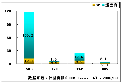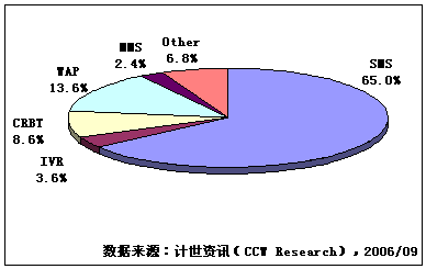 計(jì)世資訊(CCW Research)數(shù)據(jù)顯示,2006年第二季度,移動(dòng)增值業(yè)務(wù)市場(chǎng)規(guī)模達(dá)到182億元人民幣,移動(dòng)增值業(yè)務(wù)指依托移動(dòng)通信網(wǎng)絡(luò)所提供的基本服務(wù)而開展的增值數(shù)據(jù)業(yè)務(wù)服務(wù),市場(chǎng)規(guī)模包括移動(dòng)運(yùn)營商和服務(wù)提供商(SP)收入。其中SMS、IVR、CRBT、WAP和MMS市場(chǎng)規(guī)模分別為118.3、6.5、15.7、24.8和4.4億元人民幣,其他移動(dòng)增值業(yè)務(wù)市場(chǎng)規(guī)模12.3億元人民幣,包括JAVA、BREW、移動(dòng)定位等業(yè)務(wù)。