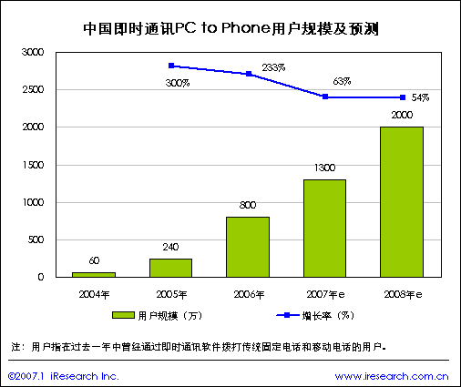 近兩年此類業(yè)務形式逐漸被網(wǎng)民所接受,據(jù)iResearch統(tǒng)計,2004年中國通過即時通訊軟件撥打普通電話的用戶僅為60萬,2006年用戶達到800萬。如果國家相關政策可以進一步開放,PC to Phone 的用戶規(guī)模將會迅速增長。