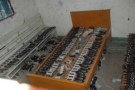 22日,辦案民警喬裝普通市民在民房里搜尋,透過窗戶終于發(fā)現(xiàn)一間房間里平整地?cái)[放著一兩百部手機(jī)。不一會(huì)兒,他們等來了房東雷某,將房門打開,眼前的一幕讓民警們大吃一驚,只見房間里的木床和椅子上一排排整齊地?cái)[放著近兩百部手機(jī),每部手機(jī)連接一個(gè)白色的盒子,指示燈在不停地閃爍著。