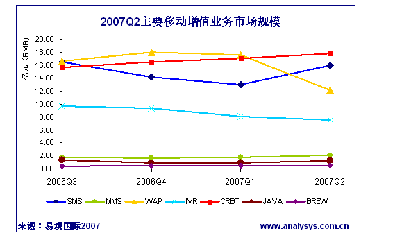 易觀國(guó)際研究表明,2007年第2季度移動(dòng)增值服務(wù)整體市場(chǎng)規(guī)模為57.42億元,同比下降2.33%。其中彩鈴業(yè)務(wù)收入居首位達(dá)17.75億元。