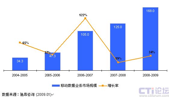 2008年中國移動數(shù)據(jù)業(yè)務(wù)市場規(guī)模達168億美元