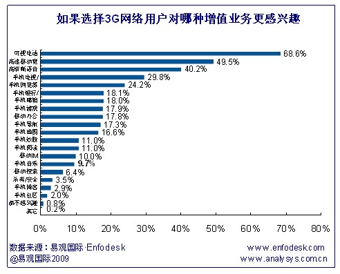 據(jù)易觀Enfodesk《中國3G市場用戶調(diào)研報告2009》研究發(fā)現(xiàn),可視電話成為最受用戶歡迎的增值業(yè)務(wù),除此之外,高速移動寬帶業(yè)務(wù)和高清晰語音受用戶選擇比例也較高,分別達(dá)到49.5%和40.2%。與此相反的是,手機(jī)社區(qū)、手機(jī)博客和殺毒/安全業(yè)務(wù)受歡迎程度最小。