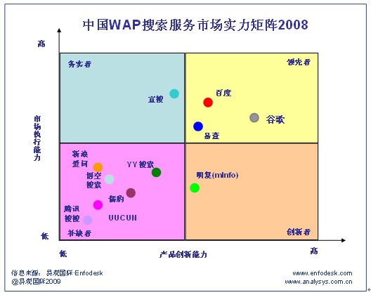 2008年WAP搜索市場(chǎng)中處于務(wù)實(shí)者象限的主要廠商是宜搜。2008年宜搜年收入占整個(gè)WAP搜索市場(chǎng)的36%。這主要?dú)w因于宜搜在整個(gè)2008年在市場(chǎng)推廣和營(yíng)銷方面投入了大量的人力以及資金投入。