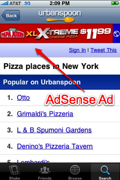 AdSense旋風(fēng)已經(jīng)刮到了iPhone和Android應(yīng)用程序里,目前iPhone的UrbanSpoon和Android的Shazam都已經(jīng)開(kāi)始集成Mobile AdSense,根據(jù)當(dāng)前應(yīng)用所顯示的內(nèi)容、你所在的地理位置、應(yīng)用的類別和關(guān)鍵字來(lái)匹配最合適的廣告。目前Mobile AdSense還在beta測(cè)試,只支持iPhone和Android應(yīng)用程序,參加beta測(cè)試的應(yīng)用程序要求每天至少要有10萬(wàn)次的廣告展示機(jī)會(huì),并在4周內(nèi)將內(nèi)置Mobile AdSense的應(yīng)用程序更新上線。