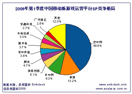 目前與新游戲平臺合作的SP包括空中網(wǎng)、騰訊、掌上明珠、TOM等在內(nèi)的共30家左右,在線游戲數(shù)量達80多款,從SP在新平臺的市場表現(xiàn)來看(具體見下圖):空中網(wǎng)占據(jù)中國移動新平臺信息費收入40.5%的份額,這促使空中網(wǎng)在手機游戲市場占據(jù)第一名的位置,目前空中網(wǎng)在新游戲平臺投放的手機游戲主要有周星星功夫臺球、異三國Online、天劫Online、功夫(周星馳大片)等,其中手機網(wǎng)游“天劫Online”的用戶歡迎度尤其突出。手機網(wǎng)游產(chǎn)品中深藍創(chuàng)娛的“深藍棋牌樂園之斗地主”、掌上明珠的“幻想i時代”、廣州盈正的“文明OL”等均有不錯表現(xiàn)。因此用戶對手機網(wǎng)游產(chǎn)品的高關(guān)注度也肯定了了新游戲平臺推出的必要性。