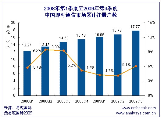 根據易觀國際Enfodesk產業(yè)數據庫即將發(fā)布的《2009年第3季度中國即時通信市場季度監(jiān)測》數據顯示,2009年第3季度中國即時通訊市場累計注冊賬戶數達到17.77億,環(huán)比增長6.1%,同比增長21%。