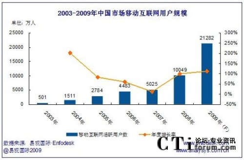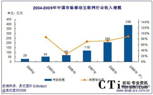 2009年中國市場移動(dòng)互聯(lián)網(wǎng)行業(yè)收入規(guī)模將達(dá)388億,年增長率達(dá)111.78%。
