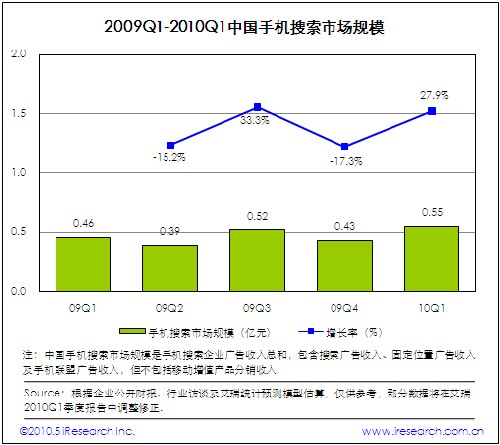 2010Q1中國(guó)手機(jī)搜索市場(chǎng)規(guī)模為5500萬(wàn),環(huán)比增長(zhǎng)27.9%,手機(jī)搜索請(qǐng)求量和PV的大幅增長(zhǎng)帶動(dòng)廣告收入增加。自2009年下半年以來(lái),受手機(jī)上網(wǎng)用戶規(guī)模迅速發(fā)展以及用戶活躍度和黏性顯著增加的影響,手機(jī)搜索市場(chǎng)進(jìn)入快速發(fā)展階段。與此同時(shí),手機(jī)搜索企業(yè)紛紛加大市場(chǎng)投入力度,建立與電信運(yùn)營(yíng)商和手機(jī)終端廠商的深度合作關(guān)系是業(yè)務(wù)拓展的重點(diǎn)方向。此外,網(wǎng)頁(yè)產(chǎn)品和客戶端軟件深度整合也是手機(jī)搜索企業(yè)布局移動(dòng)互聯(lián)網(wǎng)市場(chǎng)的最佳實(shí)踐。受谷歌事件影響,艾瑞預(yù)計(jì)2010Q2手機(jī)搜索市場(chǎng)集中度將進(jìn)一步提高。