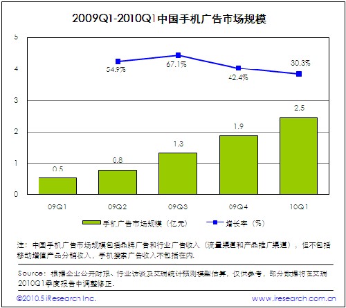 2010Q1中國(guó)手機(jī)廣告市場(chǎng)規(guī)模達(dá)到2.5億,環(huán)比增長(zhǎng)30.3%.受季節(jié)性因素影響,手機(jī)廣告市場(chǎng)增速放緩,但是保持增長(zhǎng)發(fā)展態(tài)勢(shì)。本季度,新聞、體育、數(shù)碼、女性和汽車類手機(jī)廣告市場(chǎng)表現(xiàn)良好,文本、橫幅、全屏以及客戶端軟件等手機(jī)廣告形式受到廣告主青睞。針對(duì)不同受眾群體進(jìn)行多重定向廣告營(yíng)銷成為更多手機(jī)廣告服務(wù)提供商的實(shí)踐方向。盡管本季度手機(jī)廣告市場(chǎng)取得良好的市場(chǎng)表現(xiàn)力,但是廣告定價(jià)和廣告效果評(píng)估等制約手機(jī)廣告市場(chǎng)發(fā)展的關(guān)鍵因素仍將長(zhǎng)期存在。
