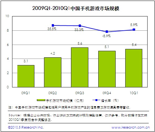 2010Q1中國(guó)手機(jī)游戲市場(chǎng)規(guī)模為5.4億,環(huán)比增長(zhǎng)5.9%.2009年底電信運(yùn)營(yíng)商調(diào)整業(yè)務(wù)合作伙伴計(jì)費(fèi)政策,導(dǎo)致WAP和G+手機(jī)游戲平臺(tái)等特定計(jì)費(fèi)平臺(tái)暫時(shí)停止計(jì)費(fèi),對(duì)手機(jī)游戲市場(chǎng)營(yíng)收增長(zhǎng)產(chǎn)生不利影響。除了季節(jié)因素以外,手機(jī)單機(jī)游戲受電信運(yùn)營(yíng)商暫停WAP計(jì)費(fèi)影響較大,手機(jī)網(wǎng)游受政策影響有限。盡管本季度手機(jī)游戲市場(chǎng)扭轉(zhuǎn)營(yíng)收規(guī)模下滑的不利局面,重新恢復(fù)增長(zhǎng)態(tài)勢(shì),但是手機(jī)游戲?qū)﹄娦胚\(yùn)營(yíng)商計(jì)費(fèi)通道的高依存度,決定行業(yè)受政策風(fēng)險(xiǎn)的影響較大。實(shí)現(xiàn)營(yíng)收多元化是手機(jī)游戲業(yè)界思考和關(guān)注的問題。