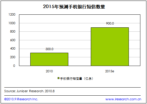 艾瑞咨詢根據(jù)Juniper Research發(fā)布的預(yù)測(cè)數(shù)據(jù)發(fā)現(xiàn),由于新類型的手機(jī)銀行短信提醒的應(yīng)用,到2015年,全球手機(jī)銀行短信量將達(dá)到900億條每年,相當(dāng)于每個(gè)手機(jī)銀行用戶每隔一天就會(huì)收到一條銀行發(fā)來的信息。
