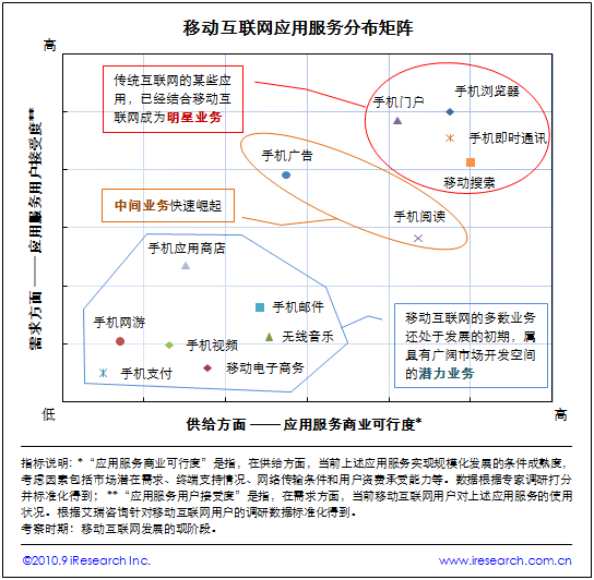 根據(jù)艾瑞咨詢近期發(fā)布的《2009-2010年中國移動互聯(lián)網(wǎng)行業(yè)發(fā)展報告》,移動互聯(lián)網(wǎng)各應用服務(wù)在“應用服務(wù)商業(yè)可行度”和“應用服務(wù)用戶接受度”兩個維度上被劃分為“明星業(yè)務(wù)”、“中間業(yè)務(wù)”和“潛力業(yè)務(wù)”三個類型。具備一定規(guī);l(fā)展市場條件,但還面臨若干限制因素的移動互聯(lián)網(wǎng)業(yè)務(wù),將在未來逐步打開市場。
