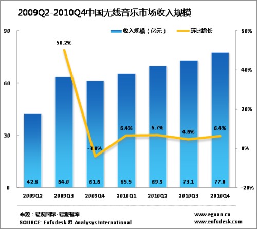 2010年第4季度中國(guó)無(wú)線(xiàn)音樂(lè)市場(chǎng)收入達(dá)77.8億元