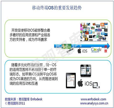 易觀國際(Analysys International)在近期發(fā)布易觀智庫Enfodesk《中國移動互聯(lián)網(wǎng)行業(yè)年度綜合報告2011》中對于移動終端OS部分進行了深入的研究。易觀國際認為,隨著3G和移動互聯(lián)網(wǎng)的迅猛發(fā)展,多樣化的移動應(yīng)用體系逐漸形成,促使具有獨立OS的智能手機市場規(guī)模不斷擴大。移動終端OS作為用戶與終端進行交互的操作接口,以及移動應(yīng)用、內(nèi)容、服務(wù)運行的平臺,對于移動互聯(lián)網(wǎng)的發(fā)展起著至關(guān)重要的意義。未來在各種形態(tài)移動互聯(lián)網(wǎng)應(yīng)用和服務(wù)爆發(fā)性增長的情況下,移動終端OS生態(tài)圈建設(shè)將走向開放,并促使多元化終端之間的互聯(lián)互通,成為終端發(fā)展的新機遇。