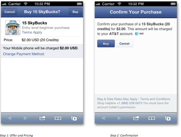 現(xiàn)在,針對應(yīng)用內(nèi)支付,F(xiàn)acebook聯(lián)合移動運營商推出了便捷的支付服務(wù),允許用戶在購買Facebook應(yīng)用開發(fā)商所提供的服務(wù)、游戲或者升級服務(wù)時,直接將交易費記到電話賬單當中。整個流程被簡化成2步:首先用戶選擇需要購買的服務(wù),然后打開支付窗口,點擊確認即可。