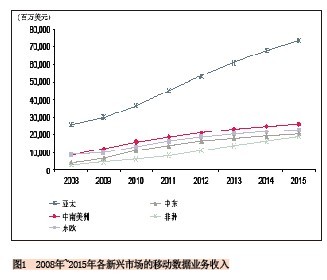 就絕對(duì)值來(lái)看亞太地區(qū)的新興市場(chǎng)將占主導(dǎo)地位,該地區(qū)的移動(dòng)數(shù)據(jù)業(yè)務(wù)收入將從2010年的368億美元增長(zhǎng)到2015年的734億美元,增長(zhǎng)率幾乎為100%。給出這么高的預(yù)測(cè)值不足為奇,因?yàn)樵撌袌?chǎng)上有中國(guó)、印度、印尼“三大巨頭”,這三個(gè)國(guó)家對(duì)該區(qū)域數(shù)據(jù)業(yè)務(wù)收入的貢獻(xiàn)將達(dá)到81%。