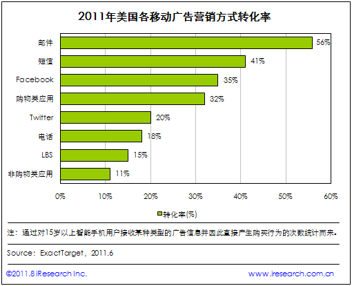 iResearch艾瑞咨詢整理ExactTarget調(diào)研數(shù)據(jù)時(shí)發(fā)現(xiàn):2011年在驅(qū)動(dòng)美國手機(jī)用戶產(chǎn)生購買的移動(dòng)廣告營(yíng)銷方式中,電子郵件營(yíng)銷的轉(zhuǎn)化率最高,達(dá)到56%,短信、Facebook、購物類手機(jī)應(yīng)用(如Amazon、eBay、Groupon)以41%、35%、32%的轉(zhuǎn)化率依次位居二、三、四位。