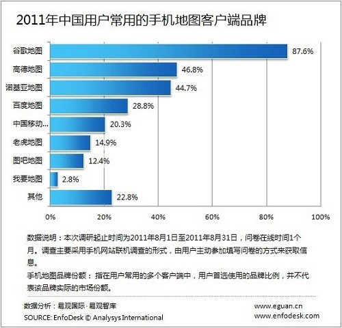 CTI論壇(ctiforum)11月25日消息(記者 潘婷婷): 據(jù)EnfoDesk易觀智庫最新發(fā)布的《2011中國手機(jī)地圖導(dǎo)航用戶調(diào)研報告》顯示,谷歌地圖、高德地圖及諾基亞地圖分別以87.6%、46.8%及44.7%的份額,占據(jù)2011年用戶最常用的手機(jī)地圖客戶端品牌份額(指在用戶常用的多個客戶端中,用戶首選使用的品牌比例,并不代表該品牌實際的市場份額,實際市場份額參見《2011年第3季度中國手機(jī)地圖客戶端市場監(jiān)測報告》)前三名的位置。