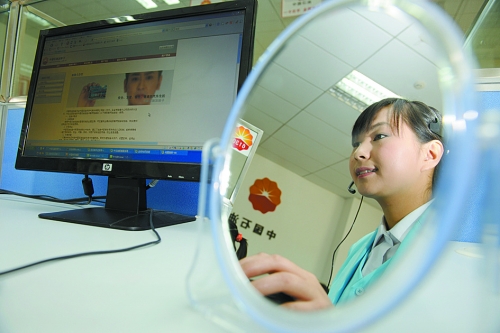 圖:客服人員通過桌上的小鏡子,可隨時觀察接聽時的表情,保持微笑