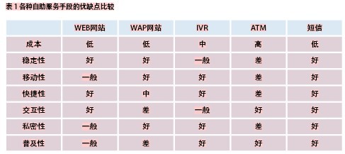 隨著電子化技術(shù)和互聯(lián)網(wǎng)技術(shù)的發(fā)展和普及,各家運(yùn)營(yíng)商都開始推出各種自助化手段分流人工服務(wù)壓力,改善用戶滿意度。主要的電子化自助手段有WEB網(wǎng)站、WAP網(wǎng)站、IVR語(yǔ)音交互應(yīng)答、ATM自動(dòng)柜員機(jī)。每種自助袷侄味加釁涓髯緣撓湃鋇恪?lt;br />