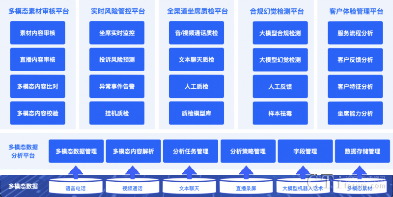 依托多項AI能力融合應用,升級后的【多模態(tài)合規(guī)分析平臺】能處理對話數(shù)據(jù)、圖片、音頻和視頻等各種格式的信息,同時采用大小模型組合式AI合規(guī)檢查機制,對各個渠道的客戶互動數(shù)據(jù)進行聚合分析,實現(xiàn)大模型構成坐席和客戶間全場景多模態(tài)數(shù)據(jù)檢測與分析,以及客戶體驗升級。