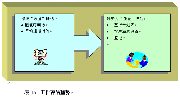 。。這些年呼叫中心工作評(píng)估經(jīng)歷了一些變化。最新趨勢(shì)是擺脫死板的"數(shù)量"評(píng)估,例如回復(fù)呼叫數(shù),通過客戶滿意度調(diào)查和監(jiān)控進(jìn)行數(shù)量評(píng)估以外的更全面的質(zhì)量評(píng)估。在表14中指出這種最新的工作評(píng)估趨勢(shì)的原因是,大量數(shù)量評(píng)估,例如回復(fù)呼叫數(shù),實(shí)際上已經(jīng)不能使員工在其基礎(chǔ)上進(jìn)行改善。例如,一個(gè)每小時(shí)接聽十個(gè)呼叫的員工并不比每小時(shí)僅接聽五個(gè)呼叫的員工效率更高。呼叫中心管理者評(píng)估員工工作更好的辦法是在這種數(shù)量評(píng)估中加入額外的質(zhì)量評(píng)估。