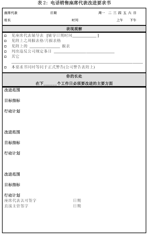 。。這里所列的兩張輔導(dǎo)表應(yīng)該是主管、質(zhì)檢與輔導(dǎo)師最常見的工具。那種無法對(duì)通話內(nèi)容進(jìn)行具體、詳盡分析,或者輔導(dǎo)人自己也定義不清, 不能給出示范與明確改進(jìn)方向的管理絕對(duì)不是專業(yè)的管理。在這類輔導(dǎo)表之外,可以根據(jù)通話的評(píng)價(jià)和其它一些紀(jì)律觀察,設(shè)計(jì)一種“改進(jìn)要求表”,將根據(jù)表現(xiàn)觀察后制定的改進(jìn)要求詳細(xì)列出。如果公司有書面警告一類的程序要求,也可揉合進(jìn)改進(jìn)要求書。