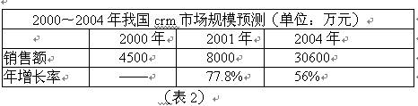 國內(nèi)CRM市場經(jīng)過一段時間的快速增長,2000年銷售額達(dá)到4500萬元左右。2001年市場情況將更好,預(yù)計銷售額將是上年的兩倍左右。CCID根據(jù)大量調(diào)查分析,對我國CRM市場規(guī)模作出如下預(yù)測: