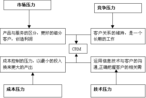 產(chǎn)品與服務(wù)的區(qū)分,更好的細(xì)分客戶,創(chuàng)造利潤(rùn)客戶關(guān)系的維持,是一個(gè)長(zhǎng)期的工作成本控制的壓力,以最小的投入換來更大的產(chǎn)出運(yùn)用信息技術(shù)與客戶的溝通,正確把握客戶的相關(guān)需求 市場(chǎng)壓力競(jìng)爭(zhēng)壓力成本壓力技術(shù)壓力