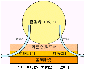 。。在本文的上一部分,筆者分析了中國證券經(jīng)紀(jì)行業(yè)的整體環(huán)境和各個券商營業(yè)部所面臨的問題以及出路方向--建立相對競爭優(yōu)勢。那么該如何建立真正的相對競爭優(yōu)勢,該如何建立起真正的有差別化的服務(wù)呢?筆者仔細(xì)分析了現(xiàn)有營業(yè)部的業(yè)務(wù)流程和數(shù)據(jù)流模型,在此基礎(chǔ)之上,設(shè)計(jì)出將來券商經(jīng)紀(jì)業(yè)務(wù)發(fā)展的業(yè)務(wù)和數(shù)據(jù)流模型,從而建立堅(jiān)強(qiáng)的相對競爭優(yōu)勢。