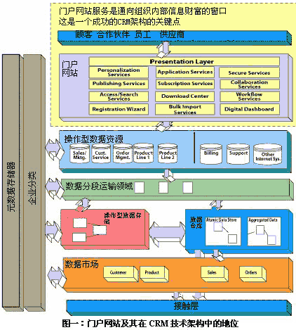 圖一向我們展示了一種CRM技術(shù)架構(gòu),它以Web門戶網(wǎng)站作為客戶、合作伙伴、員工和供應(yīng)商之間的通路,并以此作為它的主要特征。