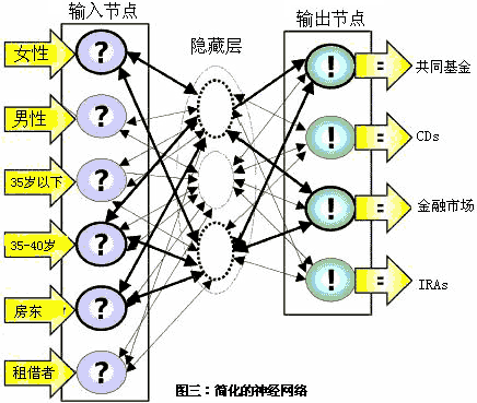 假設(shè)該集團(tuán)的數(shù)據(jù)組包括了100000個(gè)現(xiàn)有和潛在的顧客。數(shù)據(jù)組中所有成員至少滿足一個(gè)列示于每個(gè)輸出節(jié)點(diǎn)邊上的特征條件,比如說,他們的年齡小于35歲或者是在35-40之間,男性或者女性,房東或者租借人。BPN從所有的輸入節(jié)點(diǎn)中獲得數(shù)據(jù),并且以此編譯一個(gè)預(yù)測型模型。這個(gè)簡單的模型告訴使用者,年齡在35-40歲之間的男性房東最有可能購買共同基金和金融市場產(chǎn)品。這是BNP能預(yù)測的信息。