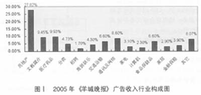 廣告客戶在報(bào)紙投放廣告的目的在于說(shuō)服讀者成為其產(chǎn)品或服務(wù)的消費(fèi)者,他們最感興趣的是向那些最有可能成為其消費(fèi)者的讀者做廣告,而“報(bào)紙讀者與廣告目標(biāo)受眾的相關(guān)性決定了廣告信息是否能夠到達(dá)廣告客戶所希望的人群”。為此,廣告客戶更愿意在其目標(biāo)消費(fèi)群接觸率高的報(bào)紙上投放廣告。由于《羊城晚報(bào)》的讀者群具有學(xué)歷較高、職業(yè)較穩(wěn)定、收入較高、消費(fèi)能力較強(qiáng)等特點(diǎn),因此成為房地產(chǎn)、汽車(chē)、電訊、家具等耐用消費(fèi)品行業(yè)塑造品牌的平臺(tái)。另外,《羊城晚報(bào)》的讀者以家庭訂戶為主,他們對(duì)健康、教育、休閑、娛樂(lè)比較關(guān)注,因此醫(yī)藥、文化教育、食品保健品、旅游等廣告在羊城晚報(bào)也占有較大比例(見(jiàn)圖Ⅰ,統(tǒng)計(jì)期間為2005年1月-10月)。