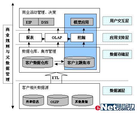分析型CRM(客戶智能)在國外的發(fā)展已有十余年,從90年代初基于部門級(jí)的專用解決方案如銷售隊(duì)伍自動(dòng)化、客戶服務(wù)和支持到以客戶為中心的整體解決方案,尤其Internet的迅猛發(fā)展及成熟的電子商務(wù)平臺(tái)大大推進(jìn)了應(yīng)用的廣度和深度。目前,客戶關(guān)系管理相關(guān)技術(shù)的研究與應(yīng)用依然是學(xué)術(shù)界和工業(yè)界研究的熱點(diǎn)。下面主要闡述下分析型CRM體系結(jié)構(gòu)的幾個(gè)層次(如下圖):