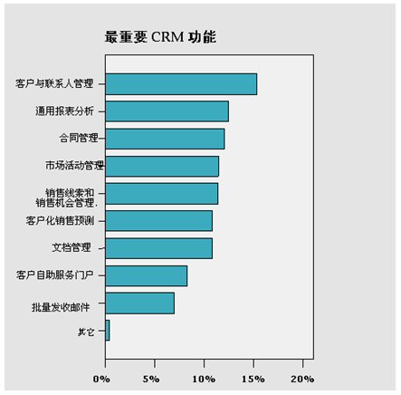 每個CRM軟件用戶必然會持有一定的目標,或者有很多急待解決的難題,從而實施CRM軟件,而在所有用戶最重要的CRM功能這個問題上,15.37%的問卷回復將“客戶聯(lián)系人管理”這個功能視為對其公司最重要的功能。而其他相對比較重要的功能為通用報表分析,合同管理,市場活動管理,銷售線索和銷售機會管理,客戶化銷售預測,文檔管理。而認為最不重要的則是客戶自助服務門戶和批量發(fā)收郵件這兩中功能,僅有8.26%和6.98%的問卷答復選擇這兩種功能為最重要的CRM功能。