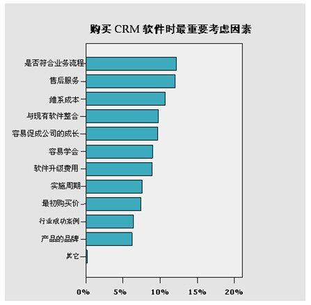用戶購買實施CRM軟件的過程其實就是CRM軟件商所提供的軟件滿足了用戶最重要的實際需求,而用戶在購買實施CRM軟件中,它們最重要的考慮因素是什么,在本次調查中,用戶在購買CRM軟件時,有12.17%的問卷回復選擇“軟件是否符合業(yè)務流程”作為其最重要的考慮因素,有12.01%的問卷回復選擇“售后服務”為最重要的考慮因素。更多的被調查者認為是否符合目前企業(yè)實際運行的流程才是是否決定購買實施CRM軟件的首要因素。而購買實施以后的技術支持和服務也是另一CRM軟件購買非常重要的考慮因素。