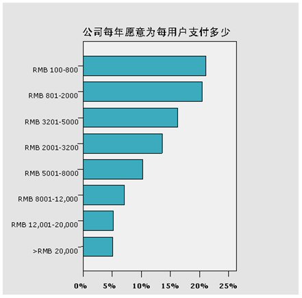 在CRM軟件實施費用方面,有41.51%的被調查者愿意支付100到2000元讓1位使用者去執(zhí)行一套功能完善的CRM軟件;而只有10.28%的被調查者愿意為每個使用者支付1.2萬元及以上去實施功能完善的CRM軟件。從這里也可以從一定程度上看出,目前市場上仍然以低端用戶為主,而中高端的用戶非常有限。