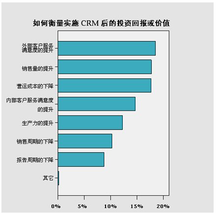 CRM用戶再實施CRM軟件后,必須計算實施的ROI(投資回報率),而各個公司對實施CRM軟件的投資回報或價值也各有不同。在本次調查中可以發(fā)現(xiàn),18.52%的被調查者選擇“外部客戶服務滿意度的提升”作為其實施CRM后的投資回報或價值,他們實施CRM軟件就是能更好的進行“客戶關系管理”,從而實現(xiàn)外部客戶服務滿意度的提升。