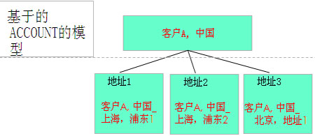 現(xiàn)在的CRM已經(jīng)從當初的銷售自動化,即SFA,基于商機的CRM(Opportunity based CRM),演化為追求長遠利益,尋求共贏的基于客戶的CRM(Account based CRM);诳蛻舻腃RM首先要將分散與公司各個部門的數(shù)據(jù),尤其是客戶數(shù)據(jù),統(tǒng)一起來,以前的CRM系統(tǒng)中,普遍采用的是所謂基于客戶(Account)的模式,即一個客戶擁有很多的地址。銷售人員在創(chuàng)建Account時,如果這個Account擁有不同的經(jīng)營場所時,會將這些不同的場所地址建立在同一客戶下面, 在記錄客戶的信息時,這樣是比較方便的。如下圖所示: