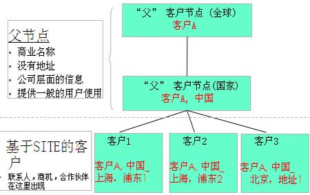 這樣對客戶的管理,尤其是對企業(yè)級客戶管理,造成了諸多不便,因為在與客戶的商業(yè)行為,絕大多數(shù)時發(fā)生在SITE級別,就是與一個總公司的不同分公司的發(fā)生的交易行為。例如: