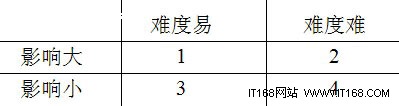 在實際工作中,筆者一般都會將用戶的需求進行分類。如下圖所示,筆者會按兩個角度對需求進行歸類,分別按難度與影響程度進行區(qū)分。如根據(jù)難度可以將需求分為容易實現(xiàn)和實現(xiàn)起來比較困難兩個級別。而根據(jù)影響程度可以將需求分為影響大和影響小兩類。