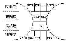 。。IP協(xié)議在多樣的物理介質(zhì)與多樣的應(yīng)用需求之間建立了簡(jiǎn)單而統(tǒng)一的映射方法。這樣形成的融合網(wǎng)絡(luò)具有沙漏型的體系結(jié)構(gòu),如圖2所示,可以靈活地進(jìn)行業(yè)務(wù)的配置和物理網(wǎng)絡(luò)的升級(jí)。由于IP技術(shù)在安全性和用戶管理方面的缺陷在三網(wǎng)融合過程當(dāng)中還不構(gòu)成大的障礙,因此基于IP進(jìn)行三網(wǎng)融合幾乎是必然的選擇。
