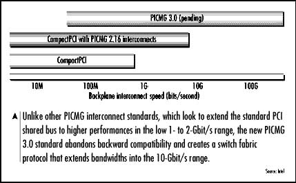 PICMG是CompactPCI的升級標(biāo)準(zhǔn),但是與CompactPCI有很大的不同,CompactPCI是共享式總線結(jié)構(gòu),而PICMG提供了交換式連接,每個(gè)點(diǎn)到點(diǎn)的連接能達(dá)到10Gbps的帶寬。圖1所示為幾種技術(shù)的互聯(lián)帶寬比較。PICMG標(biāo)準(zhǔn)的提出主要是針對電信行業(yè)方面的應(yīng)用,因此在供電方面采用了電信界的雙-48V電源標(biāo)準(zhǔn),而非CompactPCI的ATX電源標(biāo)準(zhǔn)。因此,PICMG標(biāo)準(zhǔn)與CompactPCI在很大程度上不兼容。