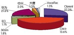 從圖3可以看出, Cisco、Clarent 和華為已經(jīng)成為我國IP電話設(shè)備市場的主要供應(yīng)商。