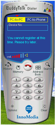 (如圖3),這個就是BuddyTalk的軟件界面。這象不象一個手機?上面的藍色部分是液晶屏。你可以選擇pc-to-pc或者pc-to-phone,下面是用來輸入電話號碼的一個空框,空框下面的部分是軟件顯示提示信息的,再下面是音量大小的顯示器。液晶屏的下面部分跟手機幾乎一樣,其中一個“search”,這是用來上網(wǎng)實現(xiàn)全球用戶數(shù)據(jù)庫搜索,一個“options”,各種設置可以在這里完成,“Memory”記錄的是你通話信息,以利快速撥號。