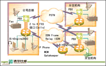 利用清華比威BitEngine系列路由器產(chǎn)品提供的VoIP(Voice over IP)支持,以及該產(chǎn)品具有的安全、加密、QoS、路由等特性,通過(guò)將長(zhǎng)話旁路到數(shù)據(jù)網(wǎng)上,為企業(yè)節(jié)省大量的長(zhǎng)話費(fèi)用開銷,同時(shí)利用豐富的接口,同原有的交換機(jī)相連,有效保護(hù)了企業(yè)原先的投資繼續(xù)有效。本方案中,使用清華比威的BitEngine2650/3600路由器實(shí)現(xiàn)企業(yè)間數(shù)據(jù)業(yè)務(wù)和語(yǔ)音業(yè)務(wù)的融合,BitEngine系列路由器提供了完善的QoS保證機(jī)制(支持PQ/WFQ/CBWFQ/WRED等多種隊(duì)列方式),確保語(yǔ)音數(shù)據(jù)的優(yōu)先處理。