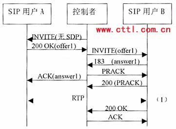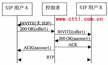 控制者首先向用戶A發(fā)送一個沒有SDP的INVITE,A的電話振鈴,A應(yīng)答之后,產(chǎn)生的200 OK響應(yīng)中將包含一個ofrerl,攜帶用戶A所希望建立會話的媒體類型、媒體格式、傳輸協(xié)議以及接收媒體流的端口和IP地址?刂普邔碜訟的offerl包含在發(fā)給B的INVITE中,B振鈴應(yīng)答之后產(chǎn)生對rfferl的應(yīng)答answerl。最后控制者向用戶A發(fā)出的ACK中包含answer1作為應(yīng)答。