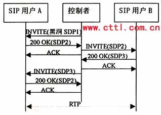 該流程中,控制者首先向用戶A發(fā)送INVITE,包含SDP1,用來創(chuàng)建一個初始的“黑洞”媒體流,A振鈴并產(chǎn)生應(yīng)答記為SDP2,其中包含的是一個有效的連接地址,但此時仍沒有媒體流向控制者。控制者向A發(fā)出ACK。   控制者向B發(fā)送INVITE,攜帶SDP2作為對B的offer。B振鈴,應(yīng)答之后產(chǎn)生的200 OK響應(yīng)中包含一個SDP3,也就是對SDP2的應(yīng)答?刂普呦駼發(fā)送ACK。